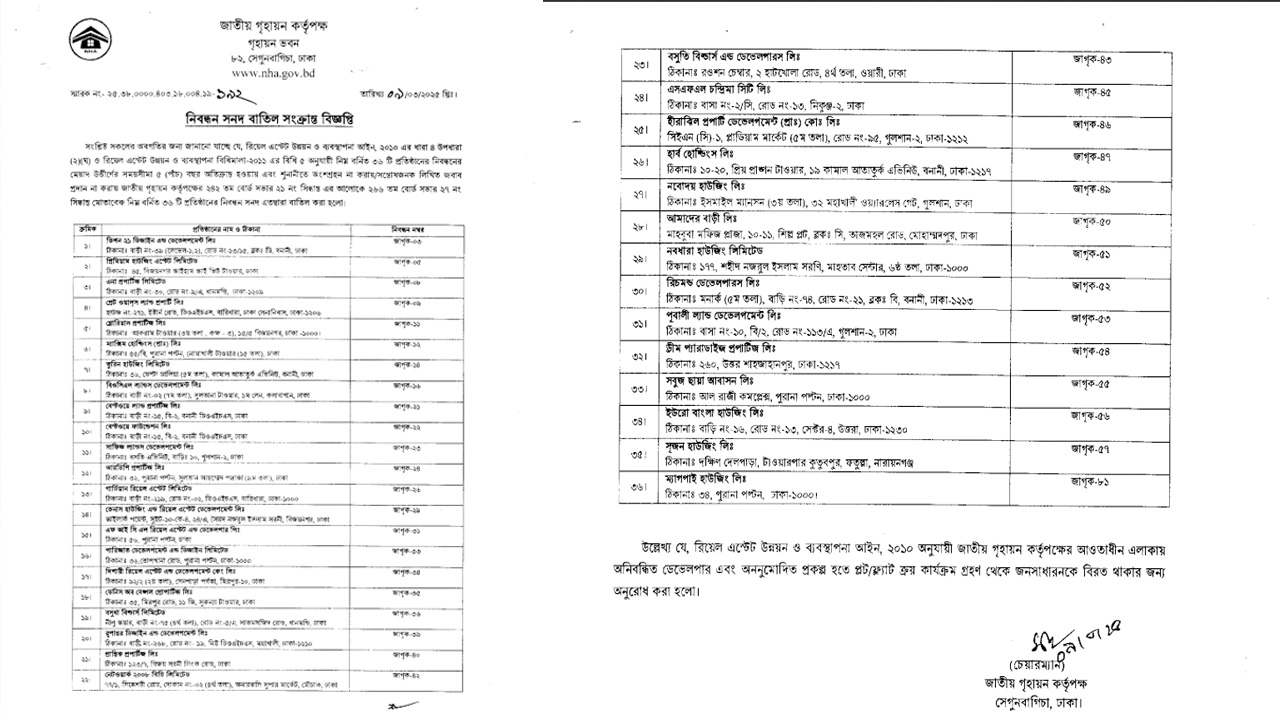 ৩৬টি রিয়েল এস্টেট কোম্পানি নিবন্ধন বাতিল হওয়ার চিঠিতে বলা হয়েছে, রিয়েল এস্টেট উন্নয়ন ও ব্যবস্থাপনা আইন, ২০১০-এর ধারা ৪ উপধারা (২)(ঘ) ও রিয়েল এস্টেট উন্নয়ন এবং ব্যবস্থাপনা বিধিমালা-২০১১-এর বিধি ৫ অনুযায়ী নিম্নবর্ণিত ৩৬টি প্রতিষ্ঠানের নিবন্ধনের মেয়াদোত্তীর্ণের সময়সীমা ৫ (পাঁচ) বছর অতিক্রান্ত হওয়া এবং শুনানিতে অংশগ্রহণ না করায়/সন্তোষজনক লিখিত জবাব প্রদান না করায় জাতীয় গৃহায়ন কর্তৃপক্ষের ২৪২তম বোর্ড সভার ২১ নম্বর সিদ্ধান্তের আলোকে ২৬৬তম বোর্ড সভার ২৭ নম্বর সিদ্ধান্ত বর্ণিত ৩৬টি প্রতিষ্ঠানের নিবন্ধন সনদ বাতিল করা হলো। রিয়েল এস্টেট উন্নয়ন ও ব্যবস্থাপনা আইন, ২০১০ অনুযায়ী জাতীয় গৃহায়ন কর্তৃপক্ষের আওতাধীন এলাকায় অনিবন্ধিত ডেভেলপার এবং অননুমোদিত প্রকল্প থেকে প্লট-ফ্ল্যাট ক্রয় কার্যক্রম গ্রহণ থেকে জনসাধারণকে বিরত থাকতে বলা হয়েছে।