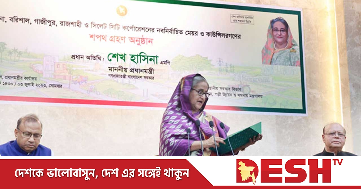 প্রধানমন্ত্রী শেখ হাসিনার কাছে শপথ নিলেন বরিশাল, খুলনা, রাজশাহী, সিলেট ও গাজীপুর সিটি করপোরেশনের নবনির্বাচিত মেয়র ও কাউন্সিলররা।