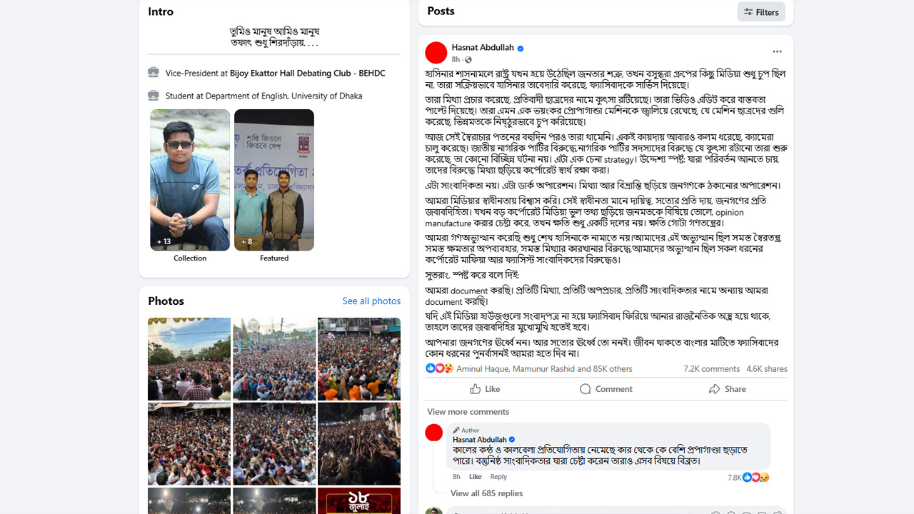 তারা মিথ্যা প্রচার করেছে, প্রতিবাদী ছাত্রদের নামে কুৎসা রটিয়েছে। তারা ভিডিও এডিট করে বাস্তবতা পাল্টে দিয়েছে। তারা এমন এক ভয়ংকর প্রোপাগান্ডা মেশিনকে জ্বালিয়ে রেখেছে, যে মেশিন ছাত্রদের গুলি করেছে, ভিন্নমতকে নিষ্ঠুরভাবে চুপ করিয়েছে।