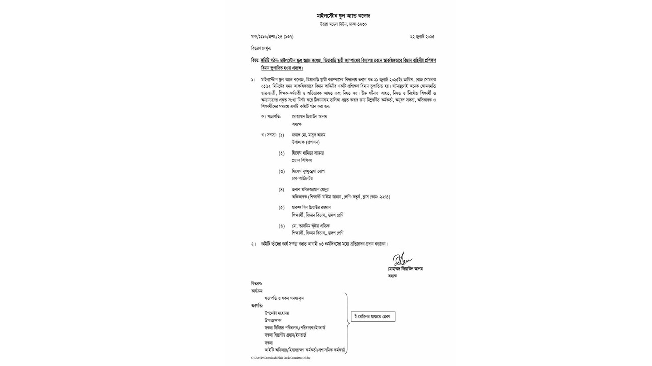 কমিটির অন্যান্য সদস্যরা হলেন—উপাধ্যক্ষ (প্রশাসন) মো. মাসুদ আলম, প্রধান শিক্ষিকা খাদিজা আক্তার, কো-অর্ডিনেটর লুৎফুন্নেসা লোপা, অভিভাবক প্রতিনিধি মনিরুজ্জামান মোল্লা (শিক্ষার্থী: যাইমা জাহান, চতুর্থ শ্রেণি) এবং দ্বাদশ শ্রেণির দুই শিক্ষার্থী—মারুফ বিন জিয়াউর রহমান ও মো. ভাসনিম ভূঁইয়া প্রতিক। কমিটিকে বিদ্যালয় কর্তৃপক্ষের পক্ষ থেকে সরাসরি ঘটনাস্থল পরিদর্শন, সংশ্লিষ্ট পরিবারদের সঙ্গে যোগাযোগ এবং নিশ্চিত তথ্য যাচাই করে তালিকা প্রস্তুত করার নির্দেশনা দেওয়া হয়েছে।