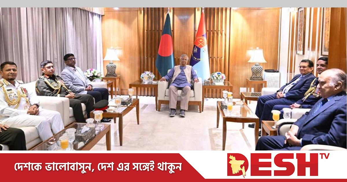 প্রধান উপদেষ্টার উপ-প্রেস সচিব আবুল কালাম আজাদ মজুমদার জানান, আজ সকালে ঢাকা সেনানিবাসে সশস্ত্র বাহিনী বিভাগে প্রধান উপদেষ্টার সঙ্গে সাক্ষাৎ করেন সেনাবাহিনী প্রধান জেনারেল ওয়াকার‑উজ‑জামান, নৌবাহিনী প্রধান অ্যাডমিরাল এম নজমুল হাসান এবং বিমানবাহিনী প্রধান এয়ার চিফ মার্শাল হাসান মাহমুদ খাঁন।