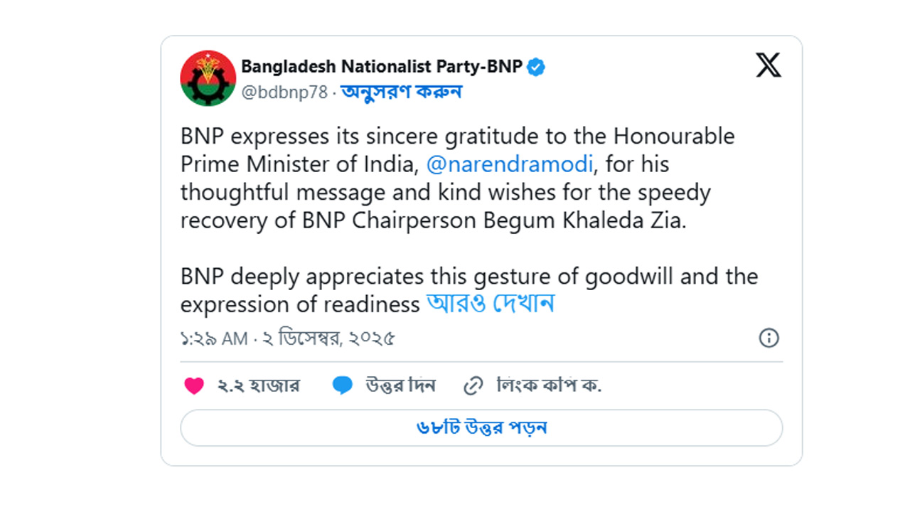 বার্তায় বলা হয়, বিএনপি চেয়ারপারসন বেগম খালেদা জিয়ার দ্রুত আরোগ্য কামনা করায় ভারতের প্রধানমন্ত্রী নরেন্দ্র মোদির প্রতি তার সুচিন্তিত বার্তার জন্য আন্তরিক কৃতজ্ঞতা প্রকাশ করছে। বিএনপি এই সদিচ্ছার নিদর্শন এবং সমর্থন প্রদানের প্রস্তুতির প্রতি গভীরভাবে কৃতজ্ঞ।