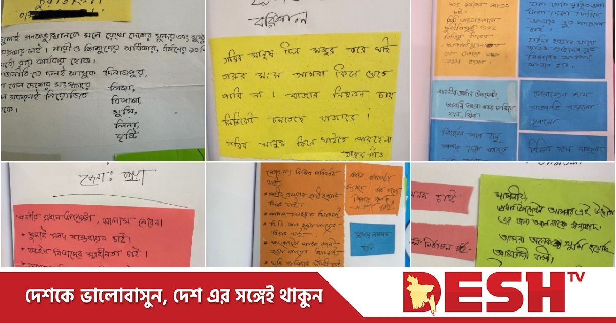 দিনাজপুর থেকে লিজা, বিপাশা, সুমি, লিনা, বৃষ্টি লিখেছেন, ‘জুলাই গণঅভ্যুত্থানকে মনে রেখে দেশের সুন্দর ও সুষ্ঠু সংস্কার চাই। নারী ও শিশুদের অধিকার, ধর্ষণের ১০ দিনের মধ্যে রায় কার্যকর হোক। রাজনীতি যে দলই আসুক দিনাজপুর না কেন দেশের সংস্কারে যেন সকলেই নিয়োজিত থাকে।’