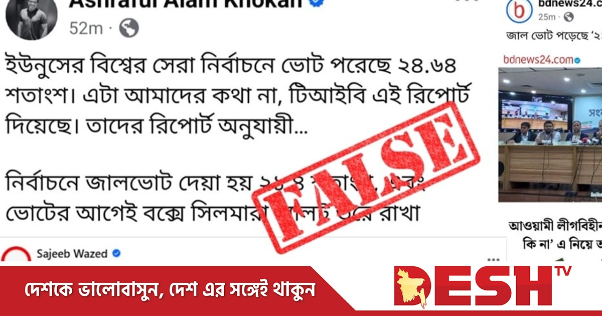 সামাজিক যোগাযোগ মাধ্যম ও দেশের মূলধারার কিছু সংবাদমাধ্যমে টিআইবির বরাতে দাবি করা হচ্ছে, ‘নির্বাচনে জাল ভোট পড়েছে ২১.৪ শতাংশ’।