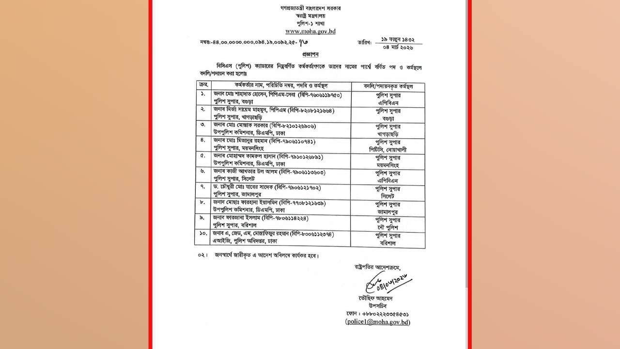 বুধবার (৪ মার্চ) স্বরাষ্ট্র মন্ত্রণালয়ের পুলিশ-১ শাখার উপসচিব তৌছিফ আহমেদ স্বাক্ষরিত এক প্রজ্ঞাপনে এ তথ্য জানানো হয়েছে।