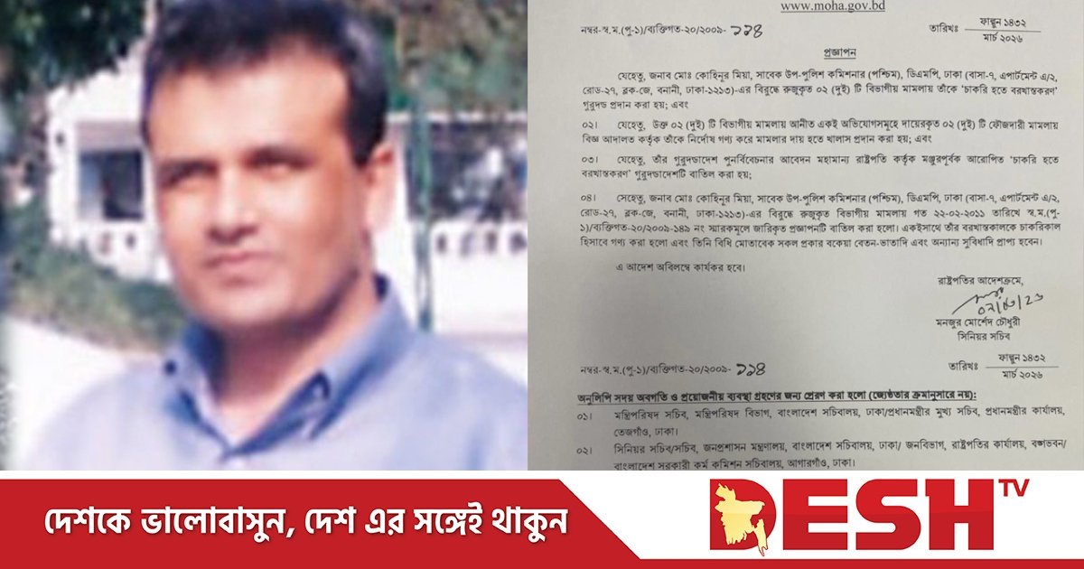 মন্ত্রণালয়ের সিনিয়র সচিব মনজুর মোর্শেদ চৌধুরী স্বাক্ষরিত প্রজ্ঞাপনে বলা হয়, ঢাকা মহানগর পুলিশের (ডিএমপি) সাবেক উপকমিশনার (পশ্চিম) কোহিনূর মিয়ার বরখাস্তকালকে চাকরিকাল হিসেবে গণ্য করা হলো এবং তিনি বিধি মোতাবেক সব ধরনের বকেয়া বেতন-ভাতা ও অন্য সুবিধা পাবেন। এ আদেশ অবিলম্বে কার্যকর হবে।