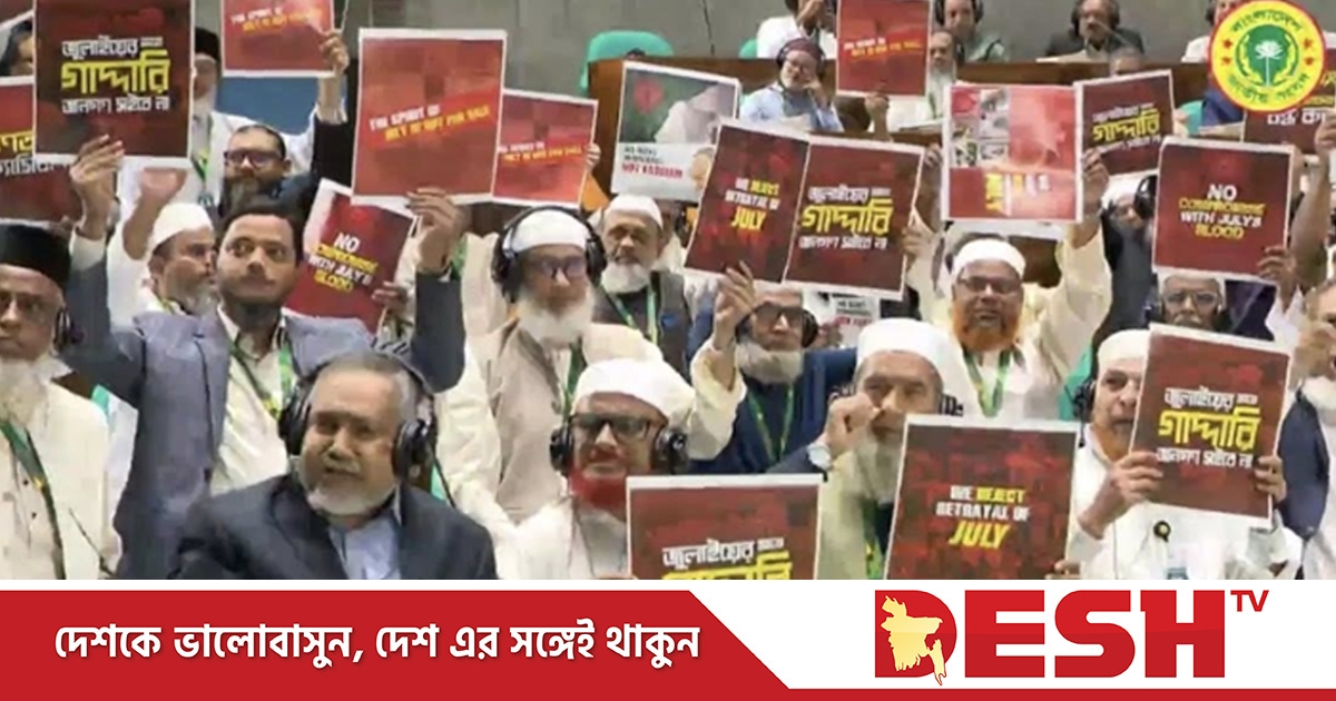 জানা যায়, সংসদ অধিবেশনে রাষ্ট্রপতি মো. সাহাবুদ্দিনকে ভাষণ দেওয়ার জন্য অনুরোধ জানান স্পিকার হাফিজ উদ্দিন। এ সময় বিরোধী দল জামায়াতের সংসদ সদস্যরা দাঁড়িয়ে প্রতিবাদ জানান। তাদের হাতে প্ল্যাকার্ড দেখা যায়। প্ল্যাকার্ডে জুলাই নিয়ে গাদ্দারি চলবে না, জুলাইয়ের সঙ্গে বিশ্বাসযোগ্যতা বন্ধ করসহ বিভিন্ন স্লোগান লেখা রয়েছে। স্পিকার এ সময় সবাইকে শান্ত থাকতে আহ্বান জানান।