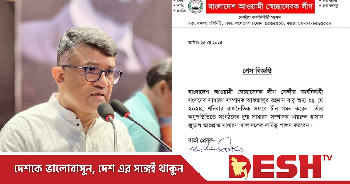 এতে বলা হয়, বাংলাদেশ আওয়ামী স্বেচ্ছাসেবক লীগ কেন্দ্রীয় কার্যনির্বাহী সংসদের সাধারণ সম্পাদক আফজালুর রহমান বাবু রাজনৈতিক সফরে চীন গমন করেন। তার অনুপস্থিতিতে সংগঠনের যুগ্ম সাধারণ সম্পাদক খায়রুল হাসান জুয়েল ভারপ্রাপ্ত সাধারণ সম্পাদকের দায়িত্ব পালন করবেন।
