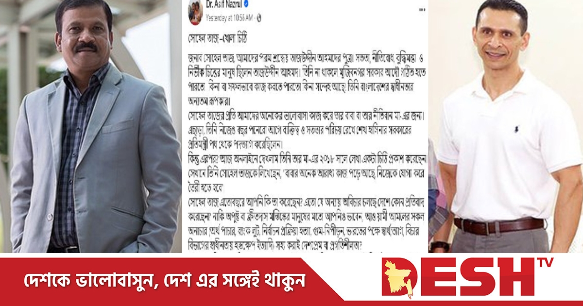 কিন্তু আওয়ামী লীগ সরকারের প্রতিমন্ত্রী পদ থেকে পদত্যাগ করে এখন পর্যন্ত দেশের মানুষের জন্য কি করেছেন? কতটুকু করতে পেরেছেন? সোহেল তাজের উদ্দেশ্যে এক ‘খোলা চিঠি’তে এমন কিছু প্রশ্ন করে নিজের ভেরিফায়েড ফেসবুক পেজে একটি স্ট্যাটাস দিয়েছেন ঢাকা বিশ্ববিদ্যালয়ের আইন বিভাগের অধ্যাপক, লেখক আসিফ নজরুল।