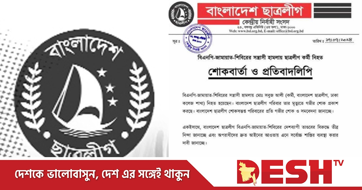 বিএনপি-জামায়াত-শিবিরের সন্ত্রাসী হামলায় কর্মী নিহতের ঘটনায় শোকবার্তা ও প্রতিবাদলিপি দিয়েছে ছাত্রলীগ।