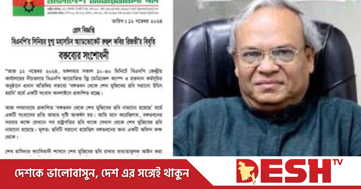 এদিকে দুপুরে রিজভীর পক্ষ থেকে বিএনপির কেন্দ্রীয় সহ দপ্তর সম্পাদক মুহম্মদ মুনির হোসেনের পাঠানো এক সংবাদ বিজ্ঞপ্তিতে বলা হয়, ‘আজ গণমাধ্যমে প্রকাশিত ‘বঙ্গভবন থেকে শেখ মুজিবের ছবি নামানো হয়েছে’ মর্মে একটি সংবাদের প্রতি আমার দৃষ্টি আকর্ষণ হয়। আমি মনে করেছিলাম, বঙ্গভবনের দরবার কক্ষে যেখানে সব রাষ্ট্রপতির ছবি থাকে সেখান থেকে শেখ মুজিবের ছবি নামানো হয়েছে। মূলত, ছবিটি সরানো হয়েছিল বঙ্গভবনের অন্য একটি অফিস কক্ষ থেকে।’