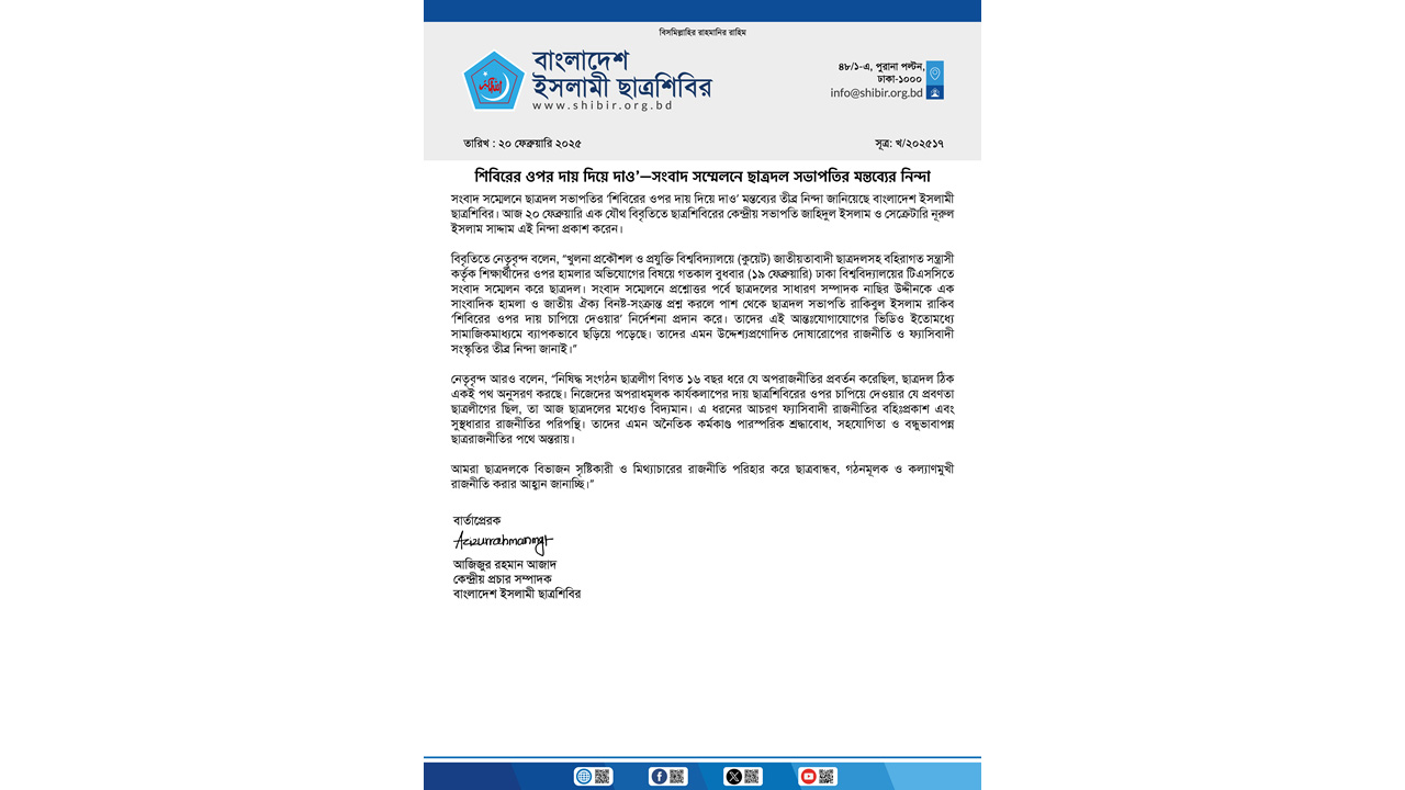 বৃহস্পতিবার (২০ ফেব্রুয়ারি) এক যৌথ বিবৃতিতে ছাত্রশিবিরের কেন্দ্রীয় সভাপতি জাহিদুল ইসলাম ও সেক্রেটারি নূরুল ইসলাম সাদ্দাম এ নিন্দা প্রকাশ করেন।