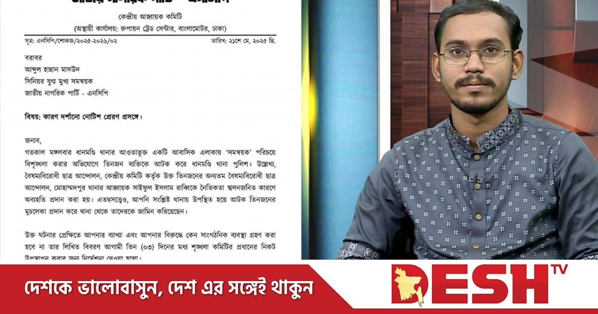 জাতীয় নাগরিক পার্টির (এনসিপি) জ্যেষ্ঠ যুগ্ম মুখ্য সমন্বয়ক আব্দুল হান্নান মাসউদকে কারণ দর্শানোর নোটিশ (শোকজ নোটিশ) দিয়েছে তার দল। ধানমন্ডি থানার একটি ঘটনায় আটককৃত তিনজনকে মুচলেকা দিয়ে ছাড়িয়ে আনার ঘটনাকে কেন্দ্র করে এই নোটিশ দেওয়া হয়েছে। তাকে আগামী তিন কার্যদিবসের মধ্যে এ বিষয়ে লিখিত ব্যাখ্যা দিতে বলা হয়েছে।