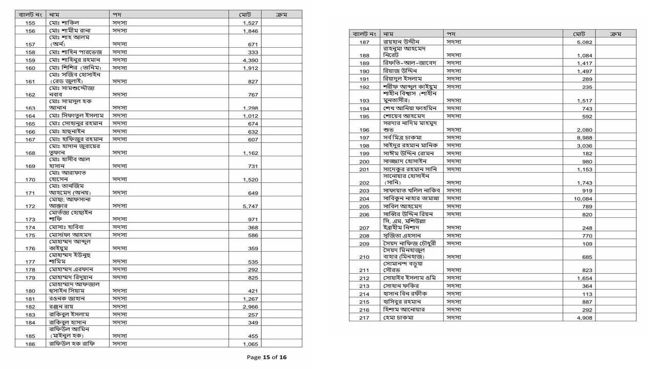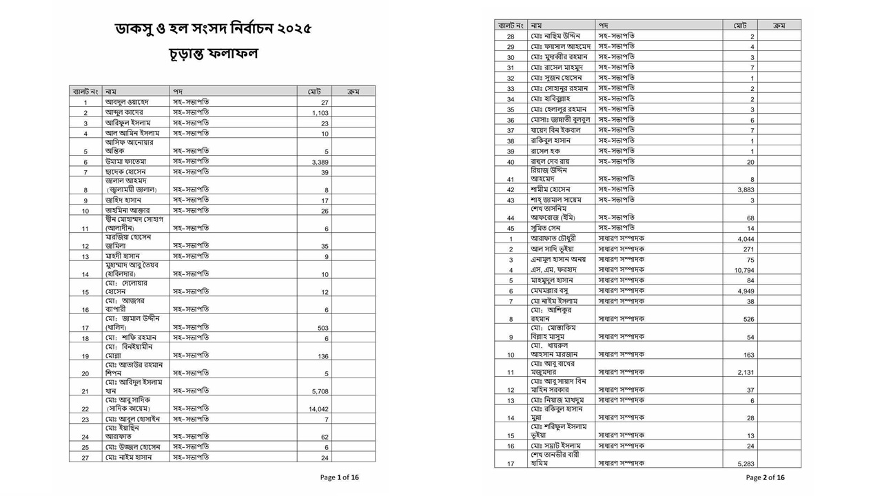 ভিপি পদে সাদিক কায়েম ১৪০৪২, আবিদ ৫৭০৮, স্বতন্ত্র প্রার্থী উমামা ফাতেমা ২,৫৪৯টি, বৈষম্যবিরোধী শিক্ষার্থী সংসদের প্রার্থী আব্দুল কাদের ৬৬৮টি, স্বতন্ত্র প্রার্থী শামীম হোসেন ১৮১৫টি ভোট পেয়েছেন।