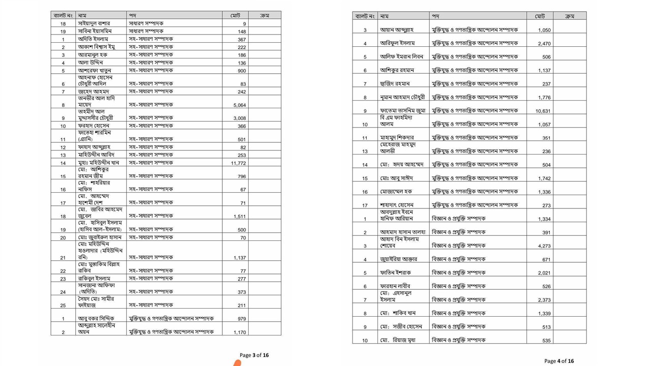 শামসুন নাহার হলে সাদিক কায়েম ১১১৪, আবিদ ৪৩৪, উমামা ফাতেমা ৪০৩ ভোট পেয়েছেন।