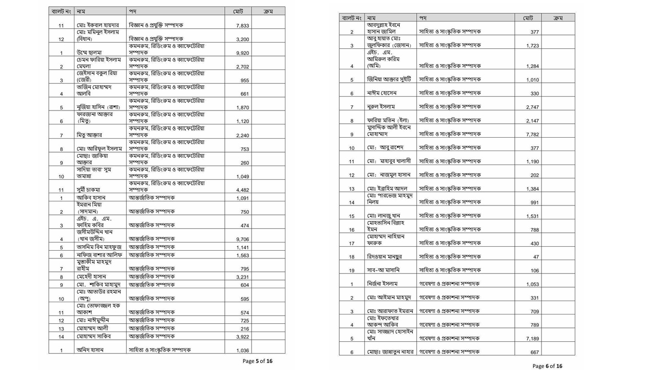 বিজয় একাত্তর হলে সাদিক ৬৩৩, আবিদ ২২১ ভোট পেয়েছেন। আর জিএস পদে ফরহাদ ৫০১, হামিম ২৭১, মেঘমল্লার ১০৬ ভোট পেয়েছেন।