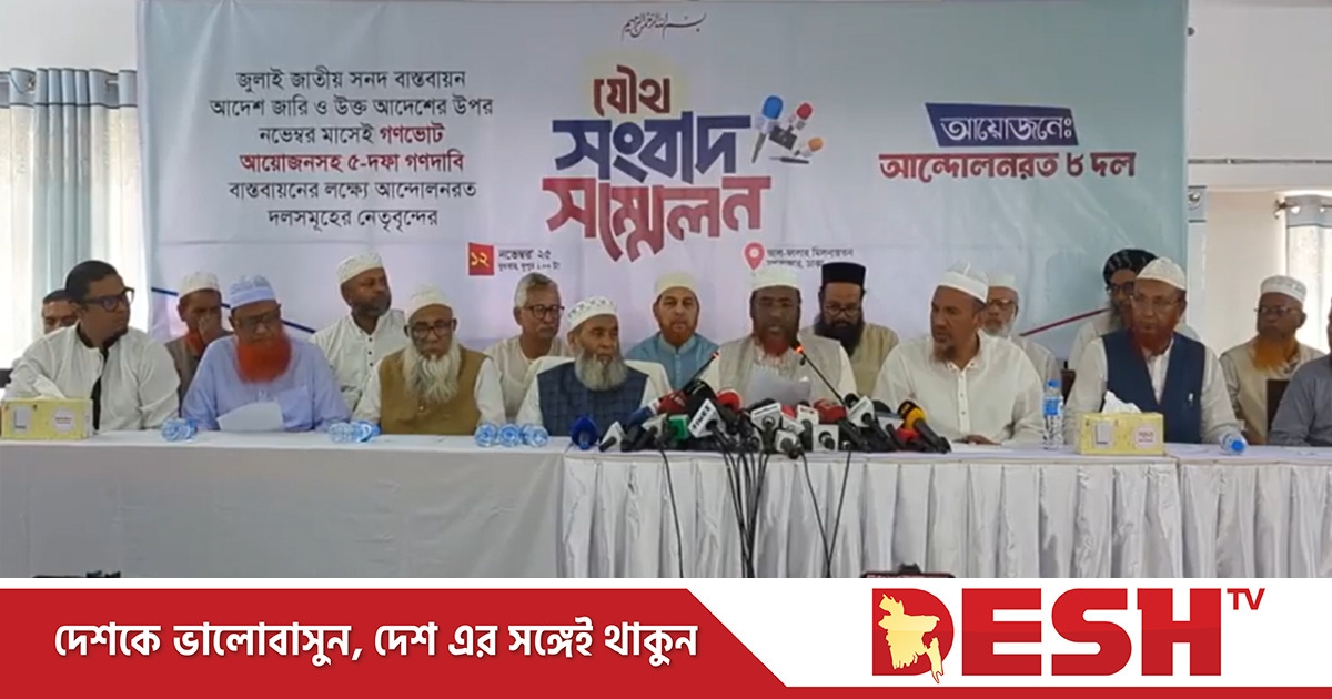 সংবাদ সম্মেলনে বলা হয়, শুক্রবার ৫ দফা দাবিতে সারাদেশে জেলা ও মহানগর পর্যায়ে বিক্ষোভ মিছিল অনুষ্ঠিত হবে। আর আগামী রোববার (১৬ নভেম্বর) সকাল ১১টায় ৮ দলের শীর্ষ নেতাদের বৈঠক অনুষ্ঠিত হবে। বৈঠক শেষে দুপুরে সংবাদ সম্মেলন অনুষ্ঠিত হবে। এর আগেই দাবি মেনে নেওয়া না হলে সংবাদ সম্মেলন থেকে প্রধান উপদেষ্টার কার্যালয় যমুনার সামনে অনির্দিষ্টকালের জন্য অবস্থানের কর্মসূচি ঘোষণা করা হবে।