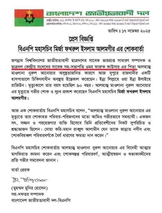 বিএনপি মহাসচিব আরও বলেন, মহান আল্লাহ যেন মরহুমকে জান্নাত নসিব করেন এবং শোকসন্তপ্ত পরিবারকে ধৈর্য ধারণের শক্তি দান করেন। তিনি মরহুমের বিদেহী আত্মার মাগফিরাত কামনা করেন এবং পরিবারের সদস্যসহ আত্মীয়স্বজন ও শুভাকাঙ্ক্ষীদের প্রতি গভীর সমবেদনা জানান।