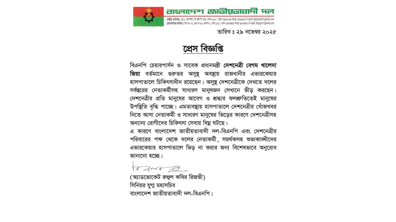 এর আগে এক প্রিস বিজ্ঞপ্তিতে খালেদা জিয়ার চিকিৎসাস্থল রাজধানীর এভারকেয়ার হাসপাতালে ভিড় না করার জন্য নেতা-কর্মীসহ শুভাকাঙ্ক্ষীদের বিশেষভাবে অনুরোধ জানিয়েছে বিএনপি।