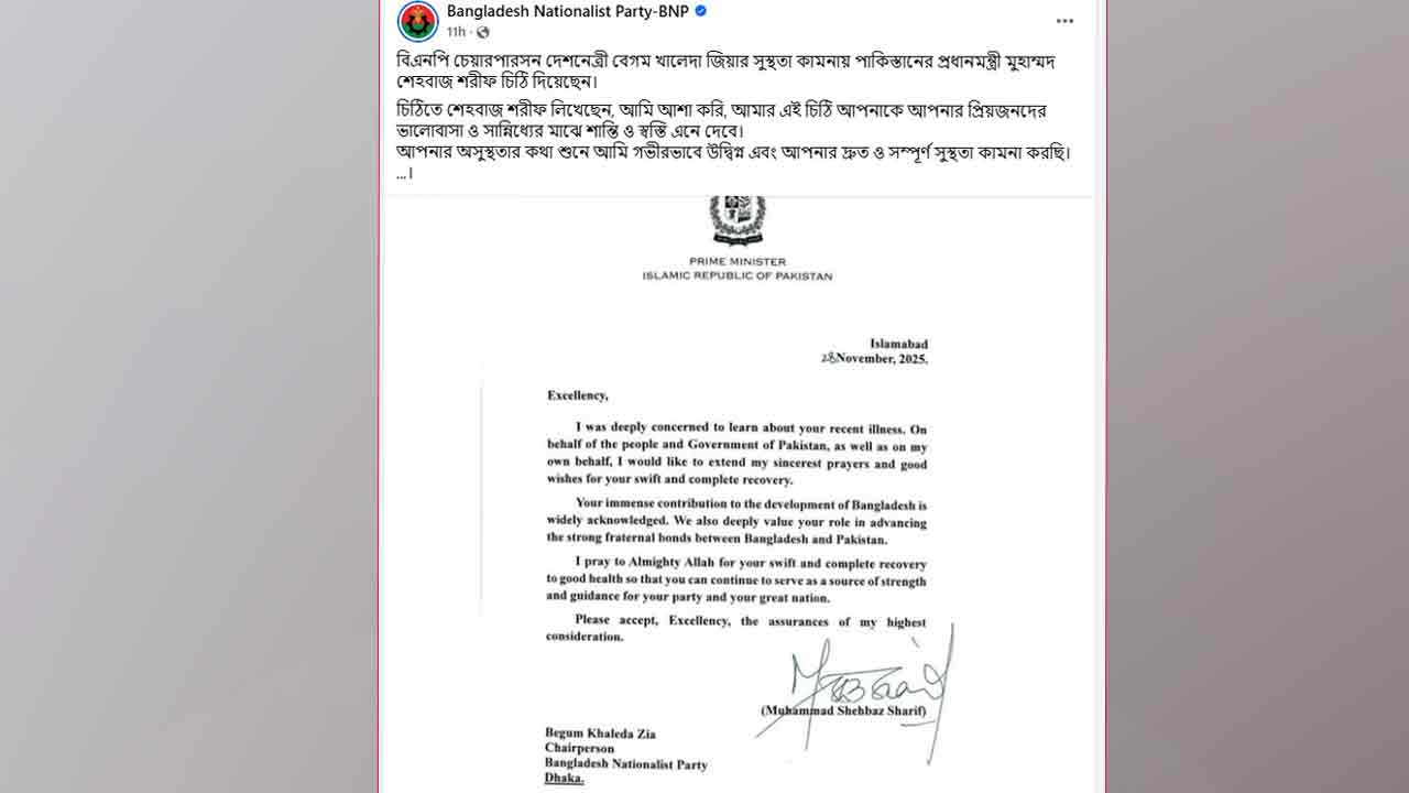চিঠিতে শাহবাজ শরিফ লিখেছেন, আপনার সাম্প্রতিক অসুস্থতার খবর জেনে আমি গভীরভাবে উদ্বিগ্ন হয়েছি। পাকিস্তানের জনগণ, সরকার ও ব্যক্তিগতভাবে আমার পক্ষ থেকে আপনার দ্রুত ও সম্পূর্ণ সুস্থতার জন্য আন্তরিকভাবে দোয়া করছি। শুভকামনা জানাচ্ছি।