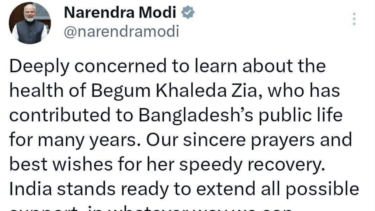 মোদি আরও বলেন, খালেদা জিয়ার দ্রুত সুস্থতা কামনায় ভারতের আন্তরিক প্রার্থনা ও শুভকামনা রইল। পাশাপাশি চিকিৎসা–সহায়তাসহ যে কোনো প্রয়োজনীয় সহযোগিতায় ভারত প্রস্তুত আছে।