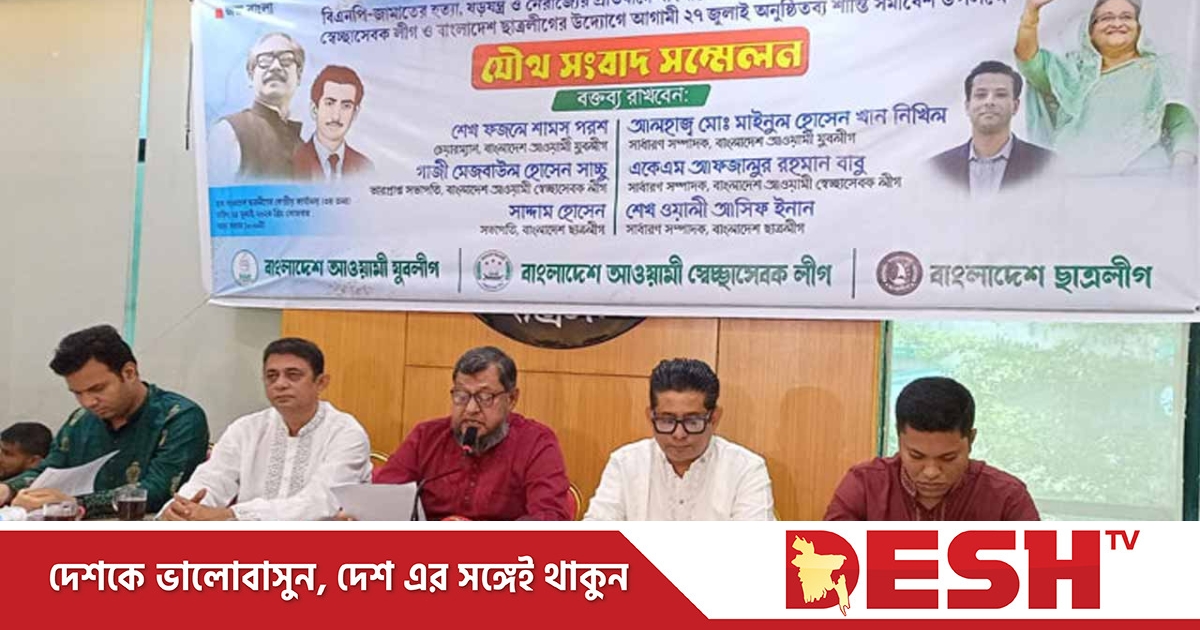 আগামী ২৭ জুলাইয়ের শান্তি সমাবেশ সফল করতে সকালে যৌথ সংবাদ সম্মেলন করে যুবলীগ, স্বেচ্ছাসেবক লীগ ও ছাত্রলীগ।