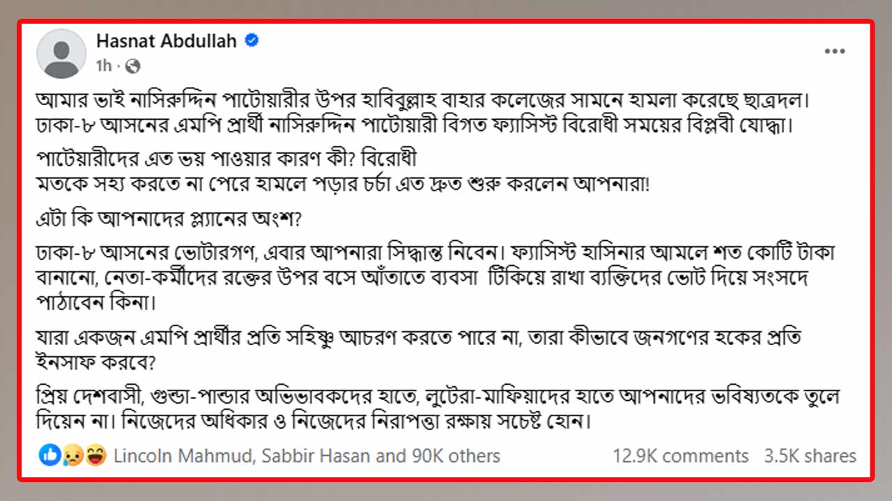 আজ মঙ্গলবার সোয়া ১টার দিকে দেওয়া এক ফেসবুক পোস্টে হাসনাত আব্দুল্লাহ বলেন, ‘আমার ভাই নাসিরুদ্দিন পাটোয়ারীর ওপর হাবিবুল্লাহ বাহার কলেজের সামনে হামলা করেছে ছাত্রদল। ঢাকা-৮ আসনের এমপি প্রার্থী নাসিরুদ্দিন পাটোয়ারী বিগত ফ্যাসিস্ট বিরোধী সময়ের বিপ্লবী যোদ্ধা। পাটেয়ারীদের এত ভয় পাওয়ার কারণ কী? বিরোধী মতকে সহ্য করতে না পেরে হামলে পড়ার চর্চা এত দ্রুত শুরু করলেন আপনারা! এটা কি আপনাদের প্ল্যানের অংশ?’