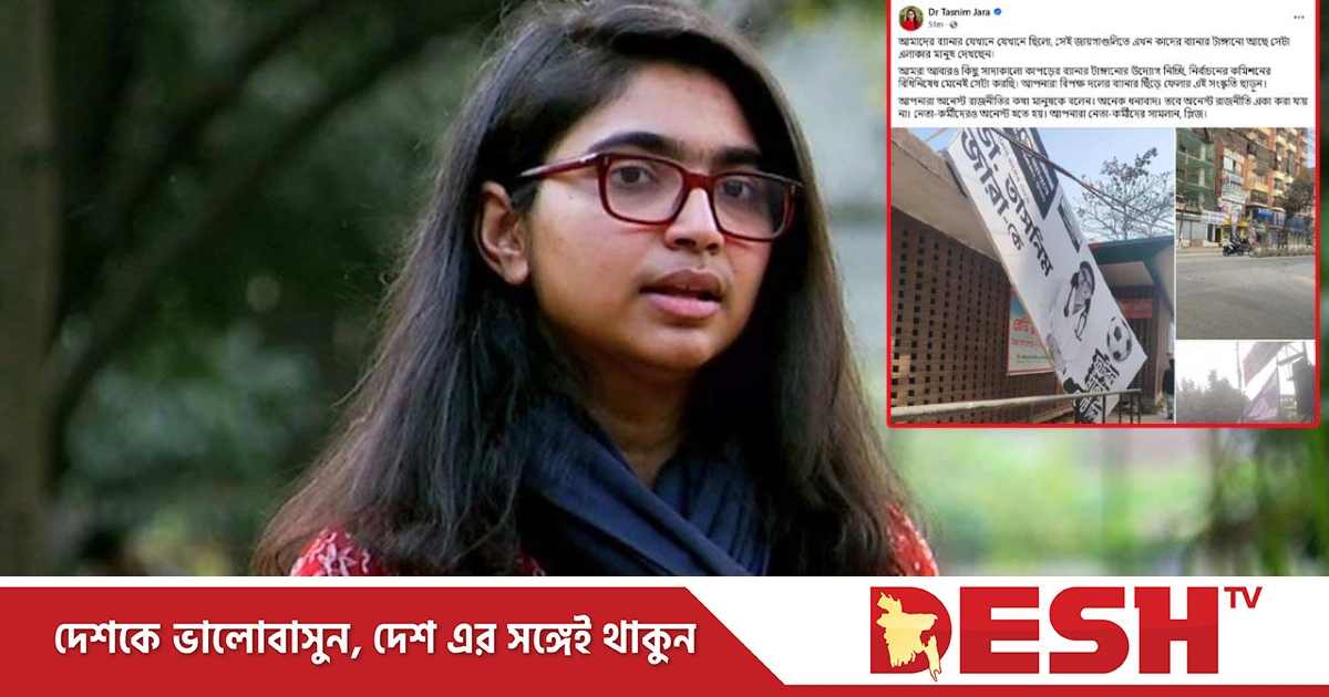 ত্রয়োদশ জাতীয় সংসদ নির্বাচনে ঢাকা–৯ আসনের স্বতন্ত্র প্রার্থী তাসনিম জারা তার নির্বাচনী প্রচারণার ব্যানার ছিঁড়ে ফেলার অভিযোগ তুলেছেন।