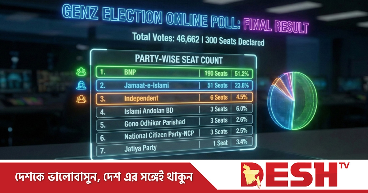 ১০ দিনব্যাপী চালানো এ জরিপে উঠে এসেছে ৪৬ হাজার ৬৬২ জন ভোটারের মত। গত ১ ফেব্রুয়ারি থেকে ১০ পর্যন্ত এ জরিপের চূড়ান্ত ফলাফলে জানা গেছে, ৩০০টি সংসদীয় আসনের মধ্যে ১৯০টি আসন নিয়ে একক সংখ্যাগরিষ্ঠতা পেয়েছে বাংলাদেশ জাতীয়তাবাদী দল (বিএনপি)।