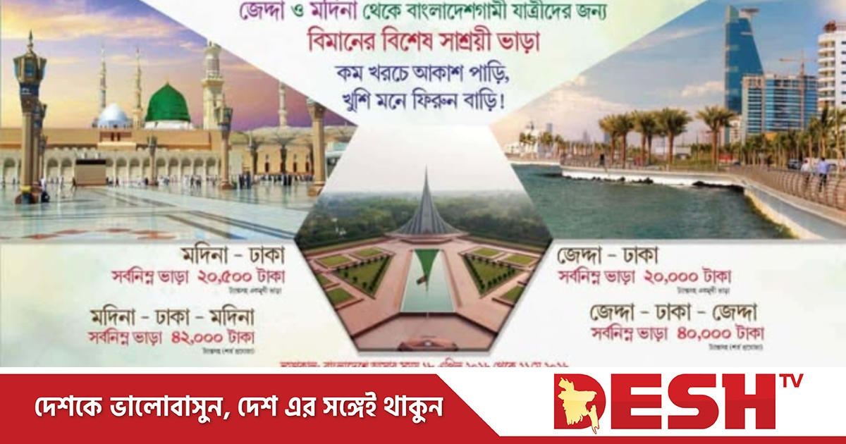 তিনি আরও জানান, এই ব্যবস্থায় মদিনা–ঢাকা ও জেদ্দা–ঢাকা রুটে একমুখী সর্বনিম্ন ভাড়া নির্ধারণ করা হয়েছে ২০ হাজার ৫০০ টাকা। মদিনা–ঢাকা–মদিনা এবং জেদ্দা–ঢাকা–জেদ্দা রুটে রিটার্ন টিকিটের সর্বনিম্ন ভাড়া ৪২ হাজার টাকা। বাংলাদেশে আগমনের ক্ষেত্রে এই বিশেষ ভাড়া কার্যকর থাকবে ১৮ এপ্রিল ২০২৬ থেকে ২৫ মে ২০২৬ পর্যন্ত এবং বাংলাদেশ থেকে ফেরার ক্ষেত্রে কার্যকর হবে ৩০ মে ২০২৬ থেকে ৩০ জুন ২০২৬ পর্যন্ত।