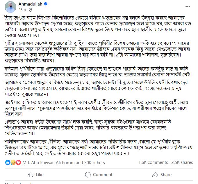 বাংলাদেশে পাঠ্যবই নিয়ে বিভিন্ন সময়ে আলোচনা সমালোচনা হয়েছে। এরই ধারাবাহিকতায় ২৮ জুন জনপ্রিয় ইসলামিক স্কলার্স শায়খ আহমাদুল্লাহ তার ভেরিফায়েড ফেসবুক পেজে একটি স্ট্যাটাস দিয়েছেন। তিনি লিখেছেন, ট্যাবু ভাঙার নামে কিশোর-কিশোরীদের একত্রে বসিয়ে ঋতুস্রাবের গল্প বলতে উদ্বুদ্ধ করছে আমাদের পাঠ্যবই। আবার উপদেশ দেওয়া হচ্ছে, ঋতুস্রাবের প্যাড কেনার প্রয়োজন হলে মাকে নয়, বাবা অথবা বড় ভাইকে বলো। শুধু তাই নয়, কোনো কোনো স্কুলে উদযাপন করে ছাত্র-ছাত্রীর হাতে একত্রে তুলে দেওয়া হচ্ছে প্যাড।