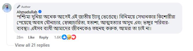 কমেন্ট বক্সে তিনি আরো লিখেছেন, পশ্চিমা দুনিয়া অনেক আগেই এই জাতীয় ট্যাবু ভেঙেছে। বিনিময়ে সেখানকার কিশোরীরা পেয়েছে অবাধ যৌনাচার, স্বেচ্ছাচারিতা, হতাশা, আত্মহত্যার অসুখ এবং ভঙ্গুর পরিবার-ব্যবস্থা। এইসব ব্যাধী আমাদের জীবনকেও তছনছ করুক, আমরা তা চাই না।