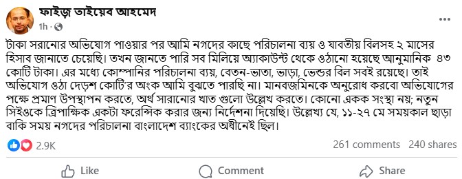 তিনি আরো লিখেছেন, ‘তাই অভিযোগ ওঠা দেড় শ কোটির অংক আমি বুঝতে পারছি না।