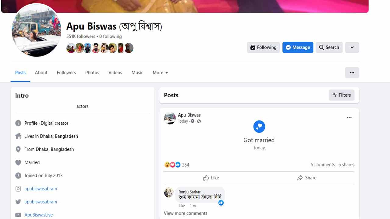 ঢালিউডের চিত্রনায়িকা অপু বিশ্বাস গট মেরিড পোস্ট করেছেন। এর কিছুক্ষণ পর সে পোস্টটি তিনি আবার ডিলিট করে দেন।