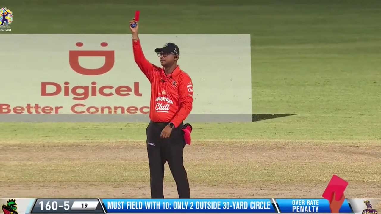 সেন্ট কিটস অ্যান্ড নেভিস প্যাট্রিয়টসের বিরুদ্ধে ত্রিনিবাগো নাইট রাইডার্স নির্ধারিত সময়ে ২০ ওভারের বোলিং কোটা পূর্ণ করতে পারেনি। তাই স্লো ওভার-রেটের দায়ে দলের একজন ক্রিকেটারকে মাঠের বাইরে যেতে হবে লাল-কার্ড দেখে।