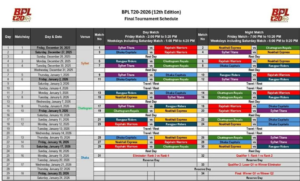 বাংলাদেশ প্রিমিয়ার লিগ (বিপিএল) এর ১২তম আসরের পূর্ণাঙ্গ সূচি প্রকাশ করেছে বিসিবি। আগামী ২৬ ডিসেম্বর থেকে শুরু হয়ে টুর্নামেন্টের ফাইনাল অনুষ্ঠিত হবে ২৩ জানুয়ারি। তিন ভেন্যু- সিলেট, চট্টগ্রাম ও ঢাকায় মোট ৩৪টি ম্যাচ আয়োজন করা হবে।