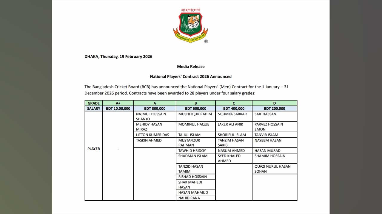 এবারের চুক্তিতে ‘এ’ প্লাস ক্যাটাগরি থাকছে না আগেই জানা গিয়েছিল। প্রথমবারের মতো চুক্তিতে জায়গা পেয়েছেন পারভেজ ইমন, তানভীর ইসলাম, হাসান মুরাদ। চুক্তিতে ফিরেছেন সাইফ হাসান, নুরুল হাসান সোহান, নাঈম হাসান, শামীম হোসেন। আগের চুক্তি থেকে বাদ পড়েননি কেউই।