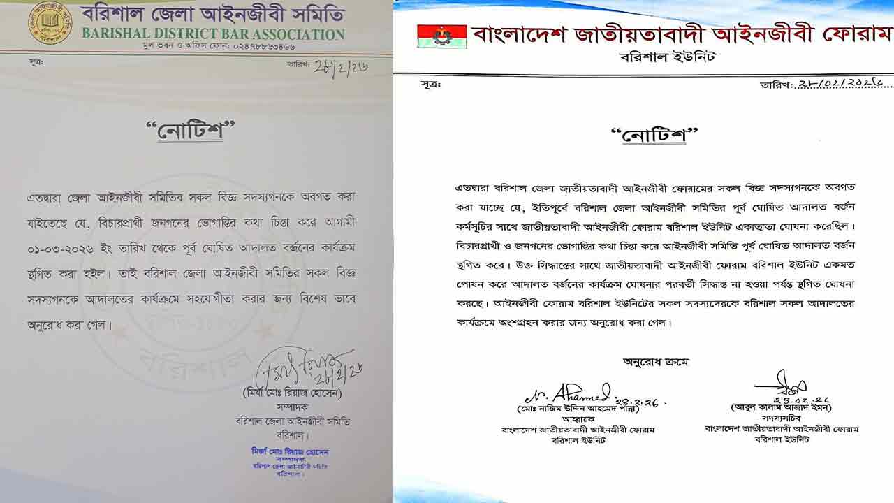 বরিশালে বিএনপিপন্থি আইনজীবীদের আদালত বর্জন কর্মসূচি স্থগিত