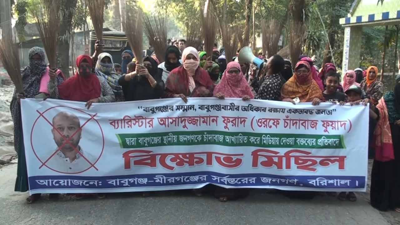 বাবুগঞ্জে ব্যারিস্টার ফুয়াদের বিরুদ্ধে বিক্ষোভ ও ঝাড়ু মিছিল