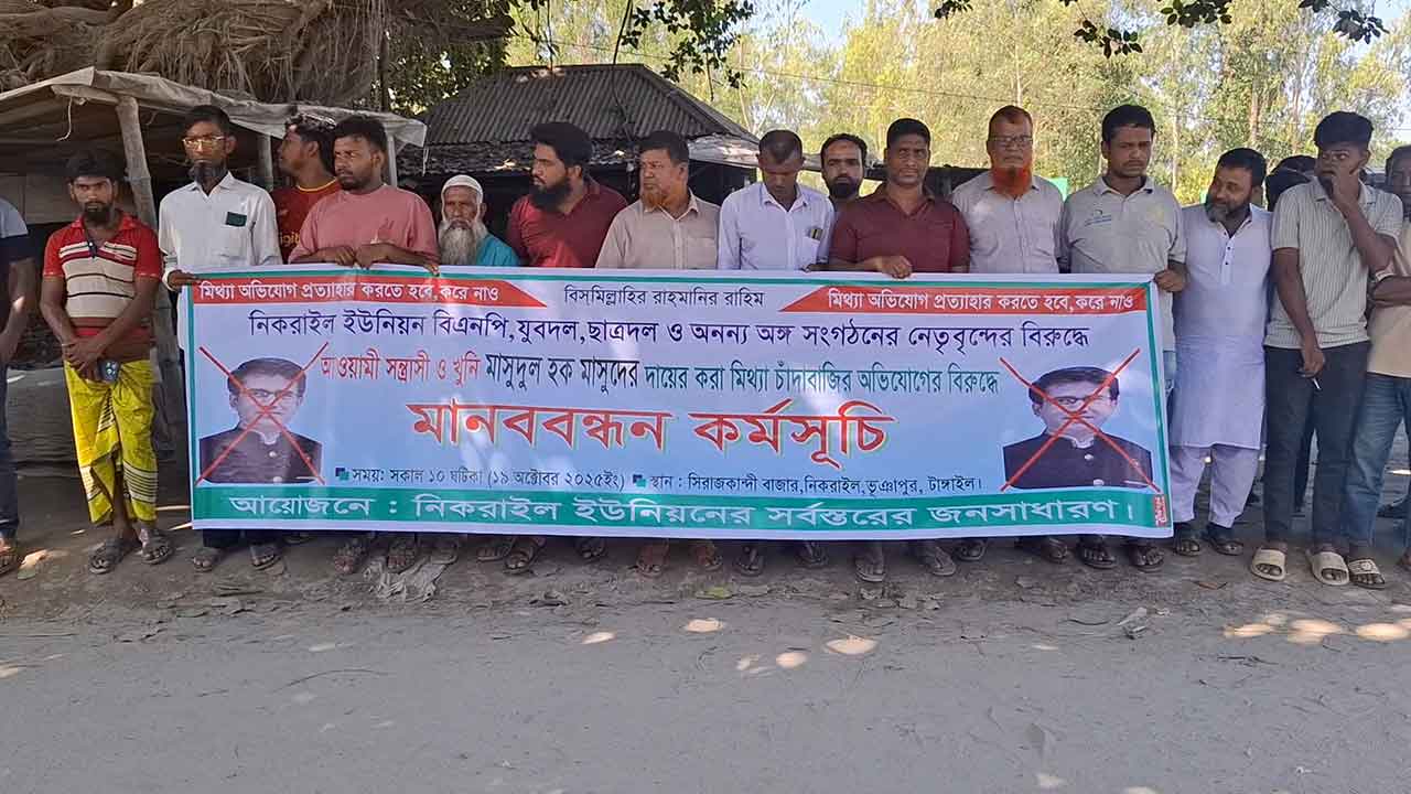 টাঙ্গাইলের ভূঞাপুরে বৈষম্যবিরোধী আন্দোলনে হামলা ও হত্যা মামলার আসামি আওয়ামী লীগ নেতা ও সাবেক নিকরাইল ইউনিয়ন পরিষদের চেয়ারম্যান মাসুদুল হক মাসুদকে গ্রেপ্তার ও শাস্তির দাবিতে মানববন্ধন করেছে এলাকাবাসী ও ছাত্রসমাজ।