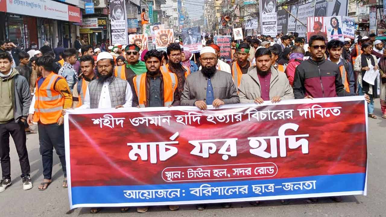 ইনকিলাব মঞ্চের আহ্বায়ক শরীফ ওসমান হাদির হত্যাকারীদের গ্রেপ্তারপূর্বক বিচারের দাবিতে বরিশালে অনুষ্ঠিত হয়েছে মার্চ ফর হাদি।