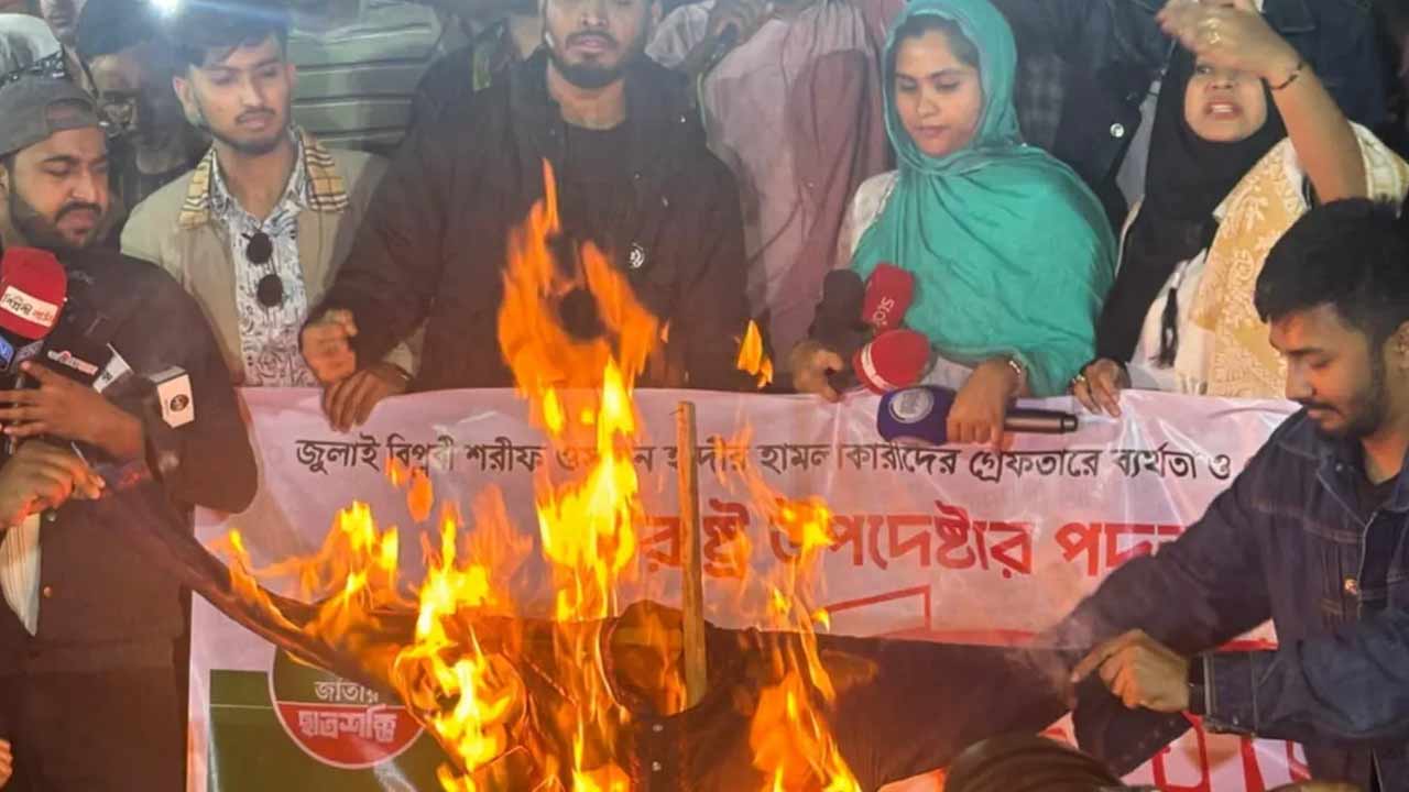 ইনকিলাব মঞ্চের আহ্বায়ক শরিফ ওসমান হাদির ওপর হামলার ঘটনায় জড়িতদের গ্রেপ্তারে ব্যর্থতা, জননিরাপত্তার অবনতি এবং চলমান আন্দোলনের অংশ হিসেবে স্বরাষ্ট্র উপদেষ্টার পদত্যাগের দাবিতে বিক্ষোভ করেছে জাতীয় ছাত্রশক্তি।