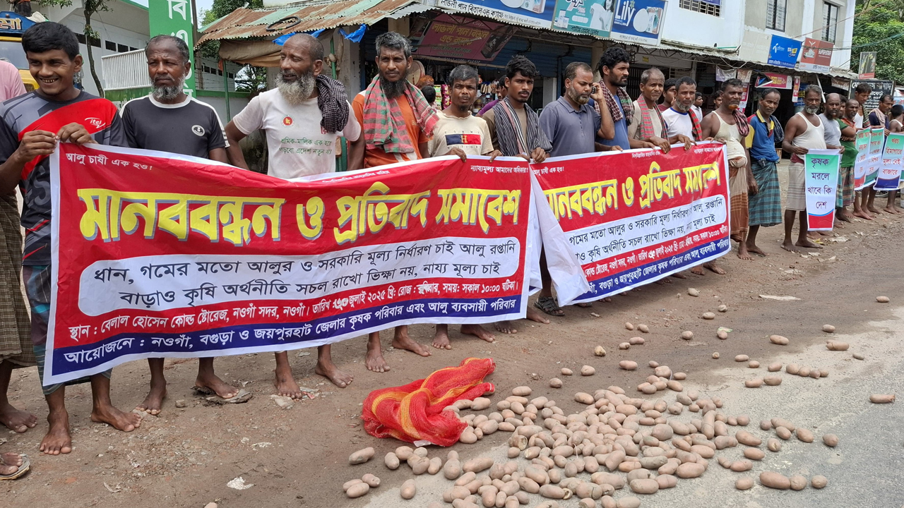 ধান-গমের মতো আলুর সরকার কতৃক মূল্য নির্ধারণের দাবিতে মানববন্ধন ও প্রতিবাদ সমাবেশ করেছে নওগাঁর আলু চাষিরা।