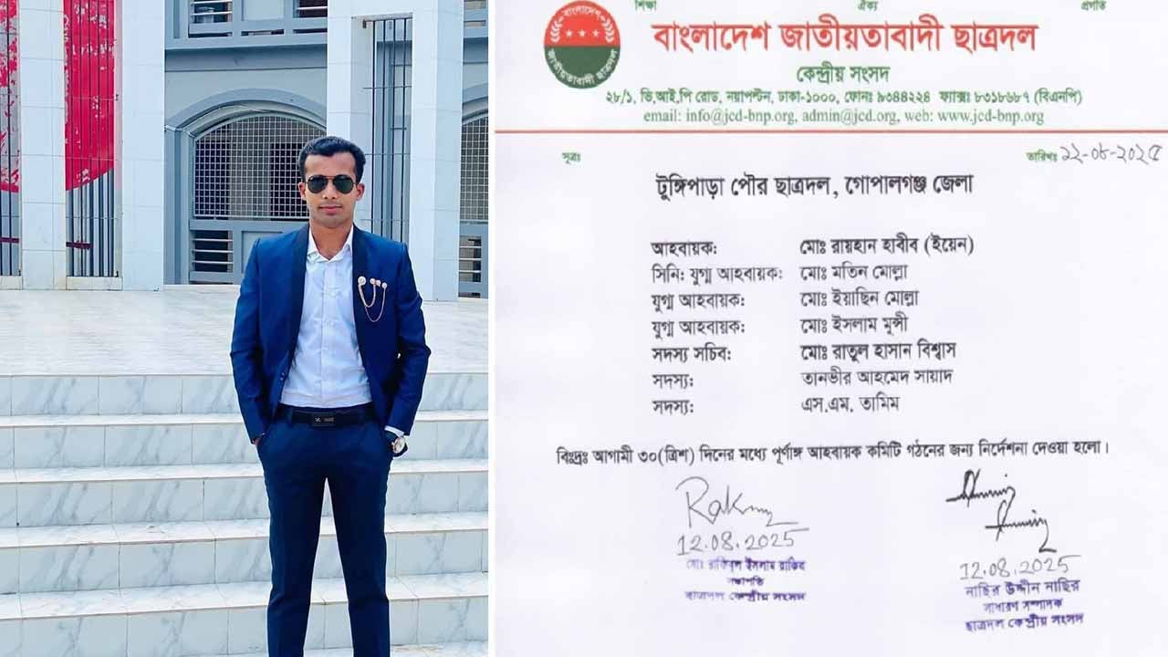 গোপালগঞ্জের টুঙ্গিপাড়ায় নিষিদ্ধ ছাত্রলীগ নেতা মো. রায়হান হাবীব ইয়েনকে টুঙ্গিপাড়া পৌর ছাত্রদলের আহ্বায়ক করে কমিটি ঘোষণা করা হয়েছে।