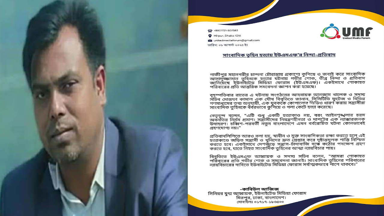 সাংবাদিক তুহিন হত্যায় ইউনাইটেড মিডিয়া ফোরামের শোক
