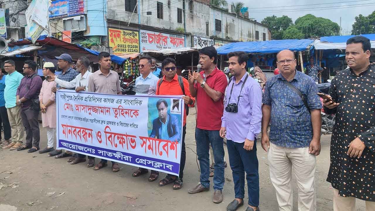 গাজীপুরে দৈনিক প্রতিদিনের কাগজ পত্রিকার সাংবাদিক আসাদুজ্জামান তুহিন হত্যাকাণ্ডের প্রতিবাদে সাতক্ষীরায় মানববন্ধন ও প্রতিবাদ সমাবেশ অনুষ্ঠিত হয়েছে।