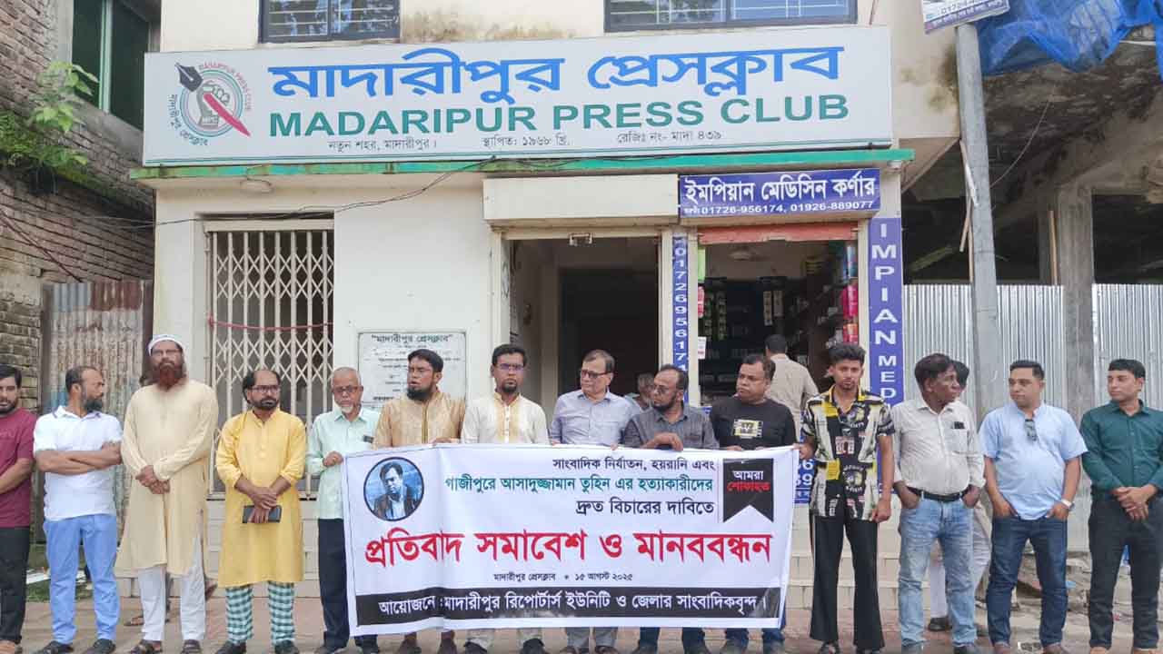 গাজীপুরে সাংবাদিক আসাদুজ্জামান তুহিনকে কুপিয়ে হত্যার প্রতিবাদ ও দোষীদের বিচারের দাবিতে মাদারীপুরে মানববন্ধন অনুষ্ঠিত হয়েছে।