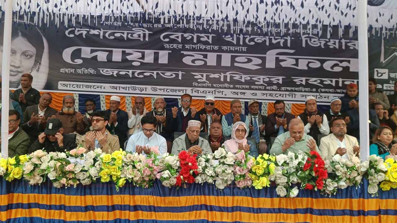 বিএনপির চেয়ারপারসন ও সাবেক প্রধানমন্ত্রী প্রয়াত খালেদা জিয়ার রূহের মাগফেরাত কামনায় ব্রাহ্মণবাড়িয়ার আখাউড়ায় দোয়া মাহফিল অনুষ্ঠিত হয়েছে।