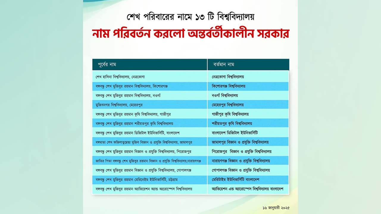 শেখ পরিবারের নামে থাকা ১৩ বিশ্ববিদ্যালয়ের নাম পরিবর্তন