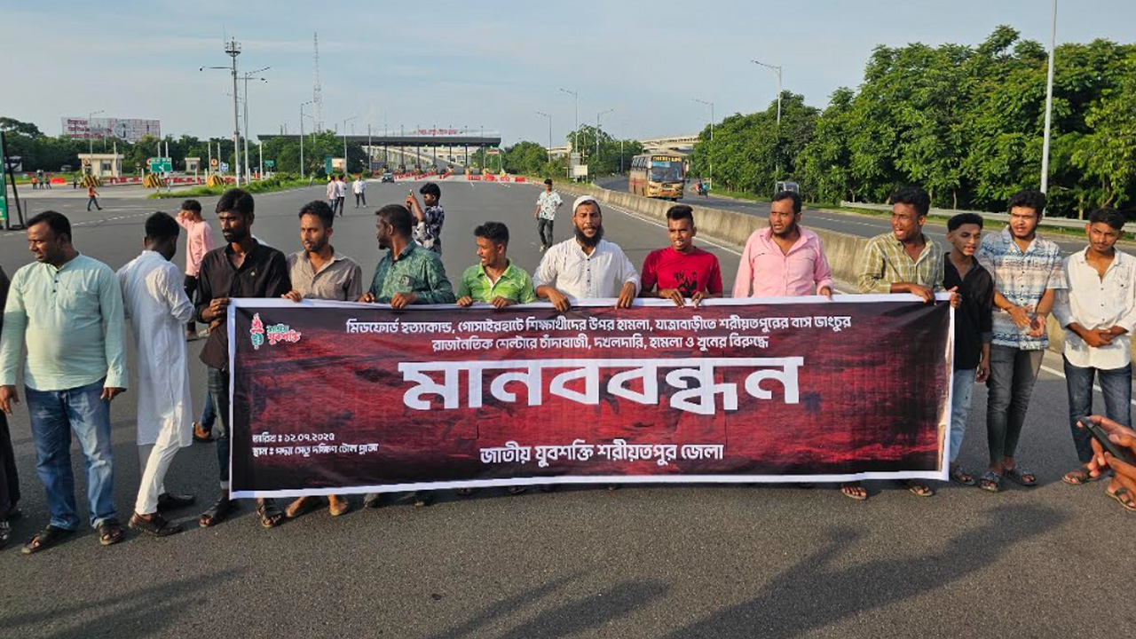 সারাদেশে চাঁদাবাজি ও মব জাস্টিস করে ঢাকার মিডফোর্ট হাসপাতালের সামনে মানুষ হত্যার প্রতিবাদে শরীয়তপুরের জাজিরা প্রান্তের পদ্মা সেতু টোল প্লাজা অবরোধ করে বিক্ষোভ কর্মসূচি পালন করেছে বৈষম্যবিরোধী ছাত্র আন্দোলন, জাতীয়